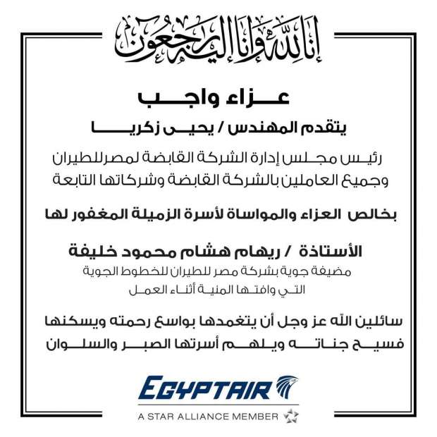 نعت الشركة الوطنية مصر للطيران، وفاة المضيفة الجوية ريهام هشام محمود الخليفة، والتي وافتها المنية في كازابلانكا أثناء رحلة عمل بالمملكة المغربية.